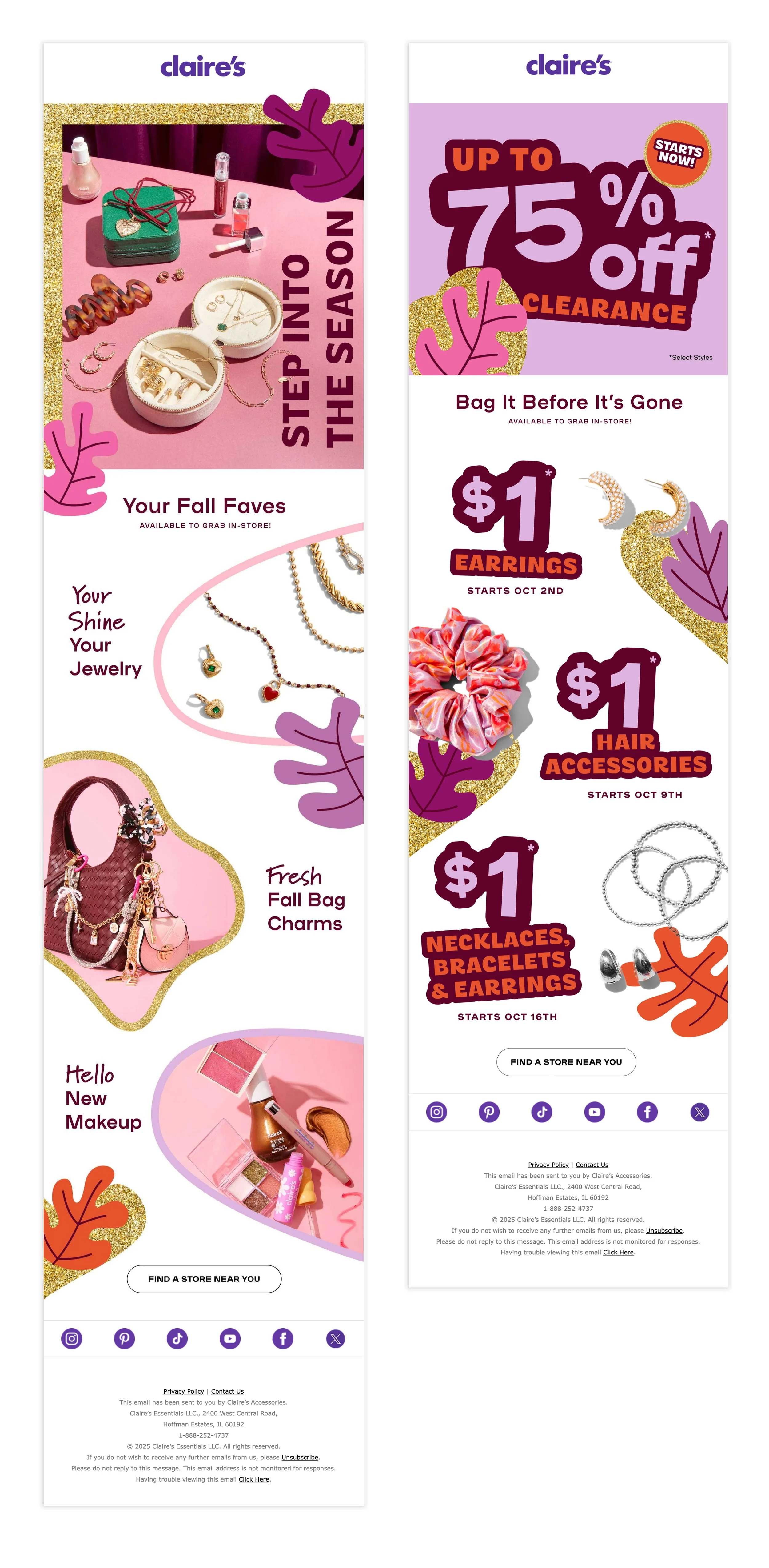 Seasonal campaign for Claire’s global fall season. I created the overarching concept and led the art direction and design for both their retail and digital experiences.